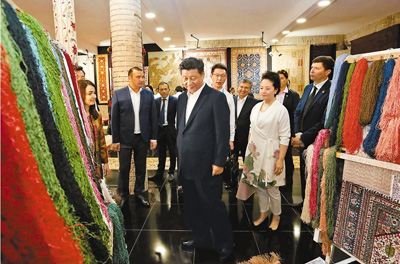 習(xí)近平和彭麗媛走進(jìn)波依卡揚建筑群旁的一家地毯和絲綢作坊。紡織女工們正在制作布哈拉傳統(tǒng)手工地毯,用嫻熟的技藝織成色彩斑斕的圖案。 王滬寧、栗戰(zhàn)書、楊潔篪等陪同參觀。 |