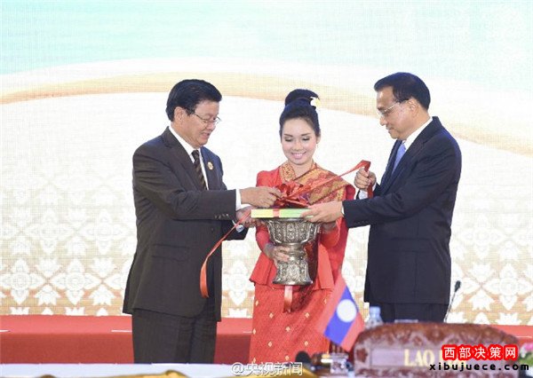 李克強(qiáng)總理7日同東盟10國領(lǐng)導(dǎo)人在老撾萬象共同出席中國—東盟建立對話關(guān)系25周年紀(jì)念儀式。觀看紀(jì)錄短片、發(fā)布對話合作事實與數(shù)據(jù)手冊后,李克強(qiáng)與東盟主席國老撾總理通倫、中國東盟關(guān)系協(xié)調(diào)國新加坡總理李顯龍在與會各國領(lǐng)導(dǎo)人見證下一起切蛋糕。