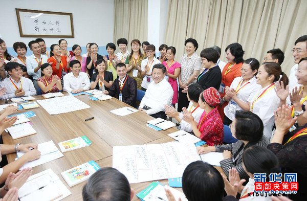 ?。?014年9月9日,習近平來到北京師范大學看望教師學生,向全國廣大教師和教育工作者致以崇高的節(jié)日敬禮和祝賀。這是習近平同正在北師大參加“中小學教師國家級培訓計劃”的貴州小學骨干語文教師交流。新華社記者姚大偉攝)