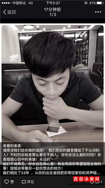 據(jù)了解,22歲的吳遠(yuǎn)旋在東莞鳳崗工作。9月3日凌晨五點(diǎn),他騎摩托車送友人上班時(shí),不幸發(fā)生車禍,導(dǎo)致重度顱腦外傷,達(dá)到腦死亡狀態(tài)。家屬召開家庭會(huì)議后,決定把吳遠(yuǎn)旋所有的重要器官捐獻(xiàn)出來,救助他人。