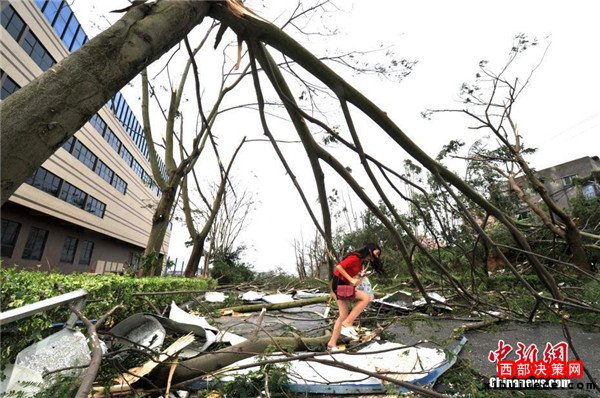 9月15日,今年第14號臺風(fēng)“莫蘭蒂”于凌晨3時05分在廈門翔安沿海登陸,登陸時中心附近最大風(fēng)力15級(48米/秒,強臺風(fēng)級),中心氣壓945百帕。圖為廈門市區(qū)路上大批車輛被吹倒的樹木損壞。