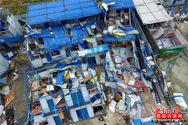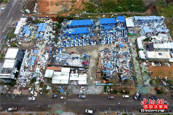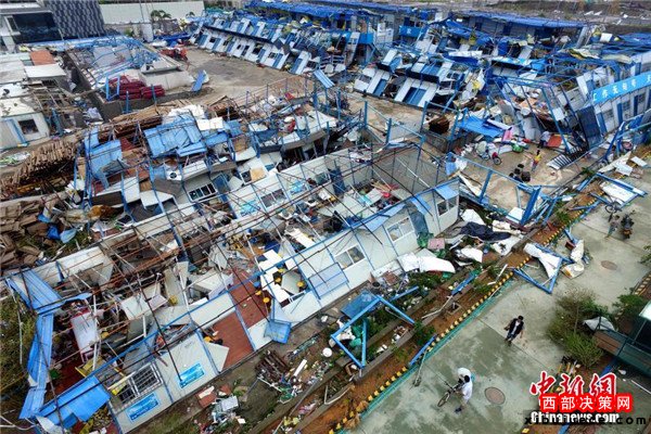 9月15日,今年第14號臺風(fēng)“莫蘭蒂”于凌晨3時05分在廈門翔安沿海登陸,登陸時中心附近最大風(fēng)力15級(48米/秒,強臺風(fēng)級),中心氣壓945百帕。圖為航拍登陸點翔安一工地工棚被完全摧毀。