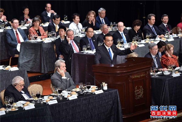 李克強(qiáng)出席紐約經(jīng)濟(jì)俱樂部舉行的歡迎宴會(huì)并致辭和回答提問