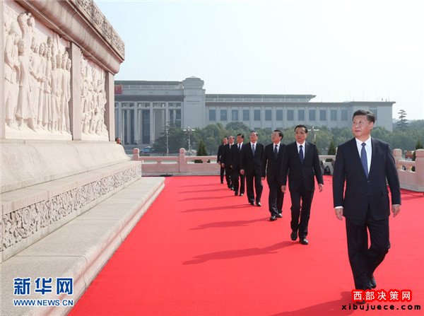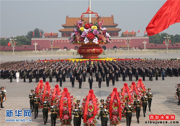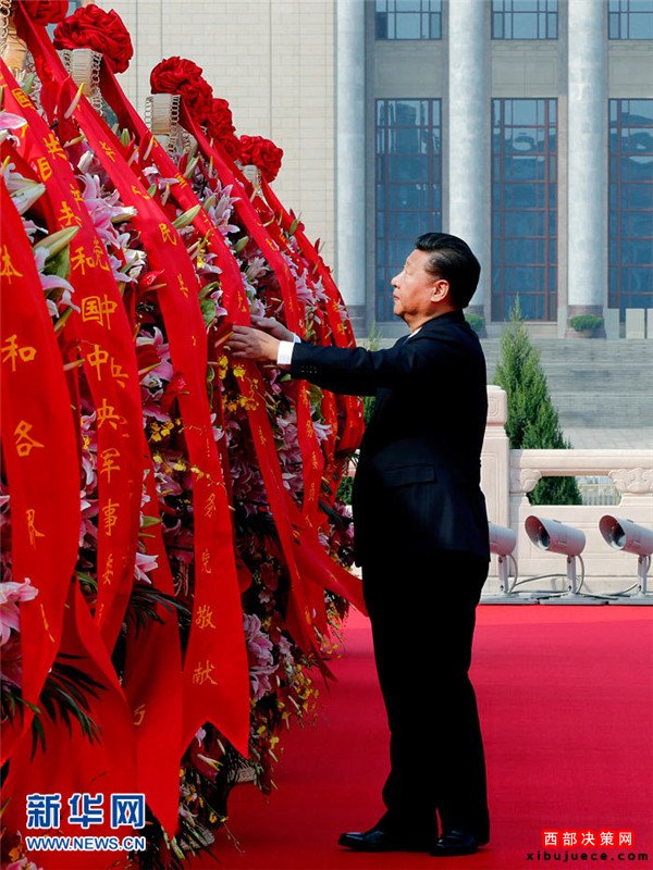 9月30日上午,黨和國家領(lǐng)導(dǎo)人習(xí)近平、李克強、張德江、俞正聲、劉云山、王岐山、張高麗等來到北京天安門廣場,出席烈士紀(jì)念日向人民英雄敬獻花籃儀式。這是習(xí)近平整理花籃上的緞帶。新華社記者鞠鵬攝