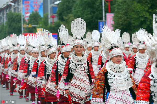 2016年10月11日,貴州省黔東南劍河縣城少數(shù)民族同胞身著節(jié)日盛裝巡游,歡慶仰阿莎節(jié)。當日,劍河縣在縣城舉行隆重的仰阿節(jié)文化節(jié)暨縣城搬遷10周年慶?;顒?,此次活動為期三天10月10日至12日。