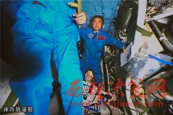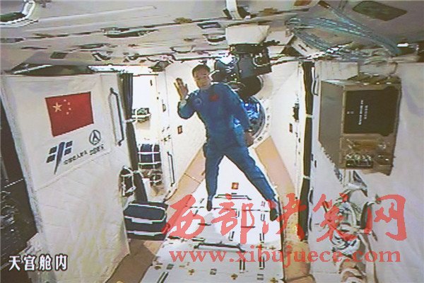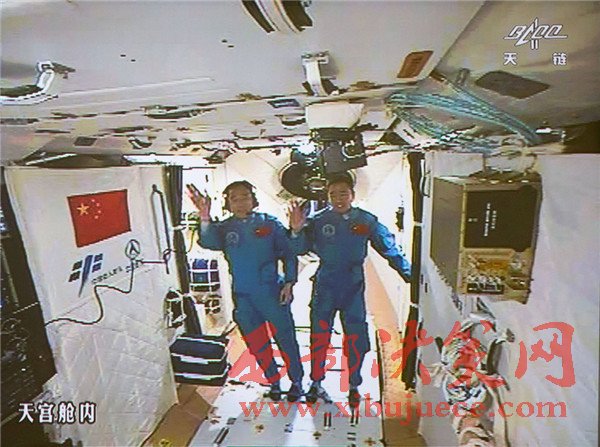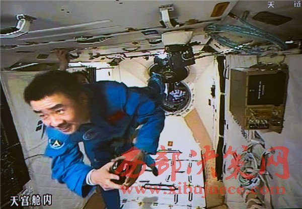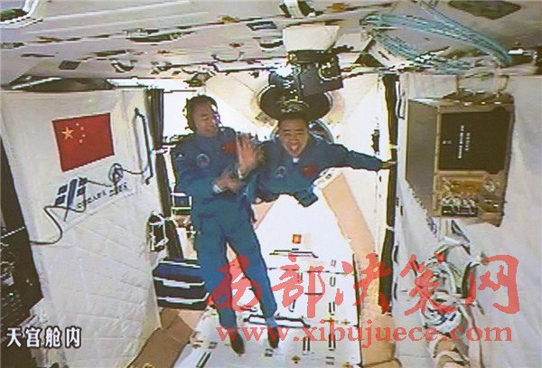 10月19日,神舟十一號(hào)航天員景海鵬和陳冬順利進(jìn)入天宮二號(hào)實(shí)驗(yàn)艙。景海鵬(左)和陳冬在天宮二號(hào)實(shí)驗(yàn)艙向全國(guó)人民問(wèn)好并敬禮(攝于北京航天飛行控制中心大屏幕)。
