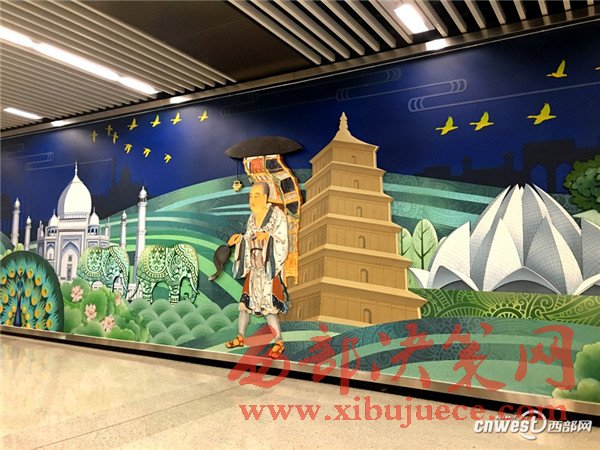 大雁塔站的文化墻也與大雁塔相關(guān),除了設(shè)計(jì)有菩提樹、天竺佛光外,還有大雁塔和唐僧等。