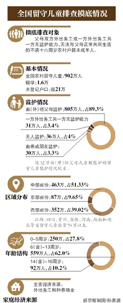 在昨日召開的農(nóng)村留守兒童關(guān)愛保護(hù)工作部際聯(lián)席會(huì)議上,民政部副部長高曉兵透露了此次摸底排查的結(jié)果。據(jù)她介紹,此次摸底排查開始于今年3月底,排查結(jié)果顯示,全國農(nóng)村留守兒童902萬人。