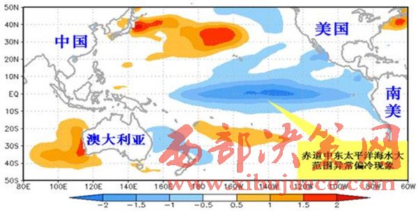 拉尼娜事件發(fā)生時海水表面溫度距平分布示意圖。(紅色表示偏暖,藍色表示偏冷,顏色越深表示偏暖或偏冷程度越強)