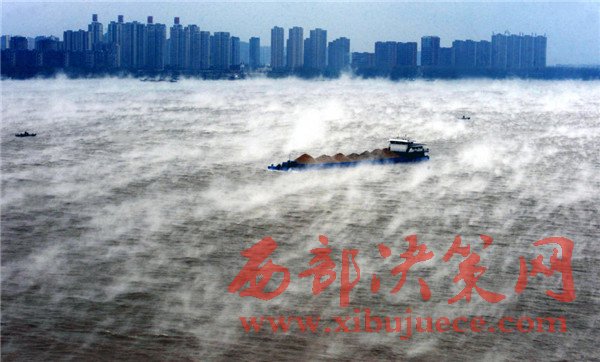 2016年11月23日,湖北武漢,寒潮帶來極速降溫后,由于江水溫度較大氣溫度高出不少,長(zhǎng)江江面上出現(xiàn)層層水霧,煙波浩渺,蔚為壯觀,放眼望去,仿佛整個(gè)城市都漂浮在云霧之中。