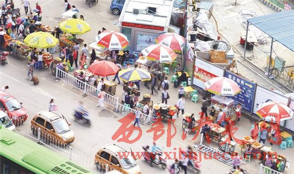 (沒有整治前。進入火車站前的道路上,商販的推車構(gòu)成兩條直直的長線。資料圖)