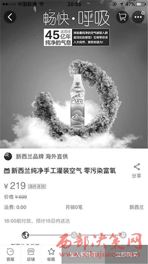 那么“空氣”到底屬于什么產(chǎn)品類(lèi)別呢?“新西蘭純凈手工灌裝空氣”店主表示,有倉(cāng)庫(kù)在新西蘭,但被問(wèn)及有無(wú)商標(biāo)時(shí),店主只表示是“新西蘭原裝進(jìn)口”,而在進(jìn)口的時(shí)候是以什么類(lèi)別進(jìn)口的呢?店主表示“不清楚。”