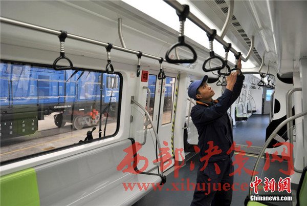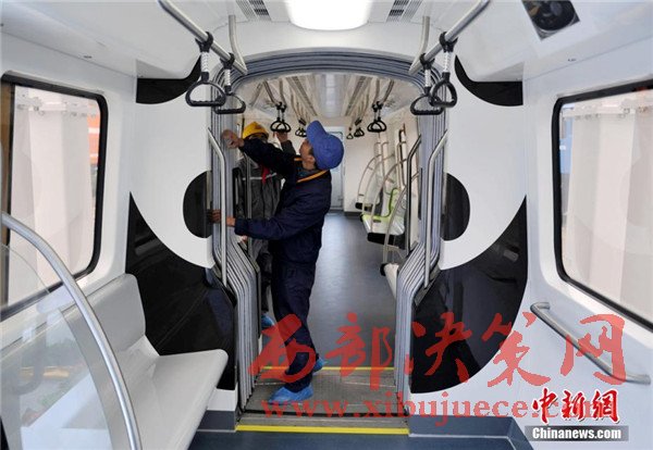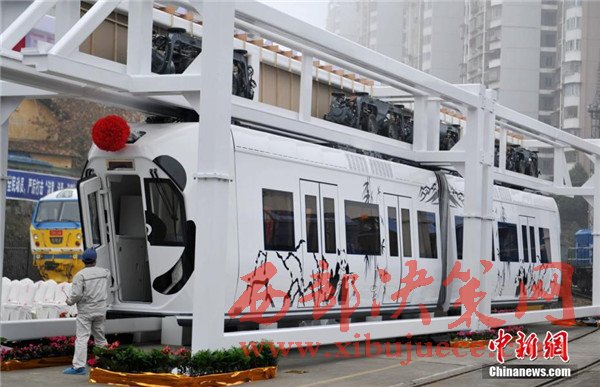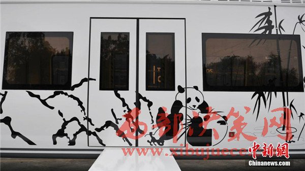 記者在現(xiàn)場(chǎng)看到,正式下線的空鐵車(chē)身為卡通熊貓山水圖案,酷似“熊貓”,每列定員144人,時(shí)速最高可達(dá)65公里。列車(chē)采用“大容量動(dòng)力蓄電池充放電控制技術(shù)”,通過(guò)實(shí)現(xiàn)高倍率放電,提高列車(chē)起動(dòng)加速性能及對(duì)極限環(huán)境的適應(yīng)性,同時(shí)能將400千瓦的電制動(dòng)功率全部用于動(dòng)力電池快速充電,實(shí)現(xiàn)制動(dòng)能量回收再利用,延長(zhǎng)蓄電池續(xù)航里程達(dá)120千米。圖為車(chē)身外繪制有熊貓山水圖案。