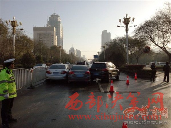 12月6日上午8時(shí)許,在渭南市區(qū)朝陽大街與三賢路丁字以西,約300米長(zhǎng)的東向車道十分濕滑,共有16輛車接連發(fā)生交通事故