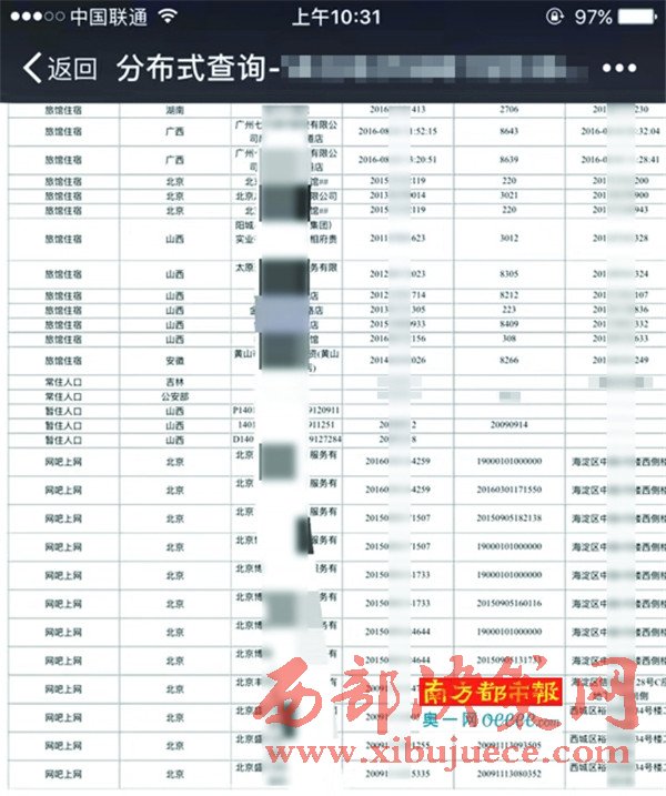 南都記者買到的同事“身份證大軌跡”,包括開房記錄、上網(wǎng)記錄、常住暫住人口信息等。