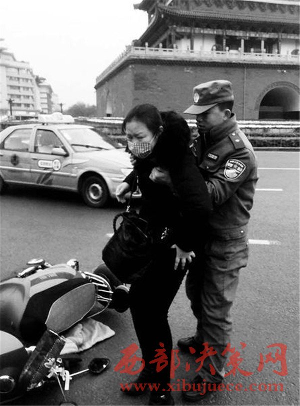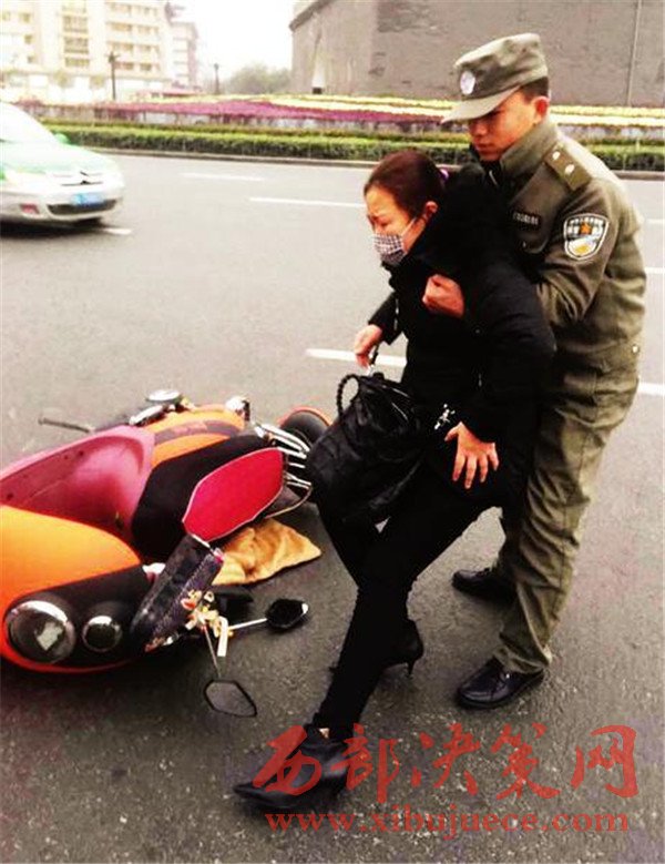 昨天17時10分,碑林區(qū)城市管理局柏樹林中隊執(zhí)法隊員馬奔和張翼在鐘樓開元商城區(qū)域正常開展巡查時,突然看見一名中年女子騎著電動車路過鐘樓十字右拐過程中,被一輛轎車撞了一下,緊接著,騎車的中年女子連人帶車倒在地上,肇事車輛當(dāng)場逃逸。