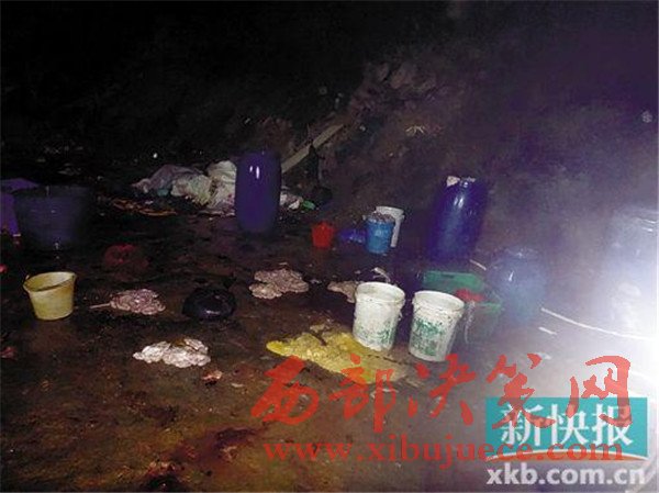 在查獲現(xiàn)場,違法人員臨時搭建的私宰帳篷里,地上鋪滿了豬血和豬毛的混合物,生豬糞便隨著水流漸漸形成一條“小河”流向遠(yuǎn)處,殺豬刀、鐵鉤、鐵叉等用于私宰的工具隨意擺放在地上,與豬毛、豬血、糞便等混合在一起?,F(xiàn)場一口直徑近2米的大鍋盛滿了水,熱氣騰騰。