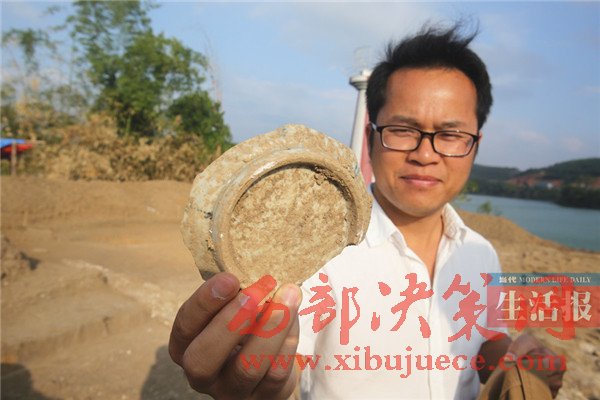 在現(xiàn)場(chǎng),一工作人員給記者展示了一枚剛出土的銅錢,該枚銅錢只有人的食指般大小。據(jù)工作人員介紹,像這類的銅錢目前已經(jīng)發(fā)掘出了十枚,銅錢散落在發(fā)掘遺址的各個(gè)角落,除了銅錢外,考古人員還揭露了部分青磚砌筑的建筑基址,地層中也出土了少量的生活用陶瓷殘片。由此推斷,鎮(zhèn)江樓遺址在清代時(shí)曾有人住宿和生活過,這和史料中關(guān)于鎮(zhèn)江樓常設(shè)駐軍的記載相符。據(jù)黎文宗介紹,2014年時(shí)考古隊(duì)曾對(duì)鎮(zhèn)江樓遺址進(jìn)行全面調(diào)查,2016年開始試掘,此前,鎮(zhèn)江樓遺址因受左江南岸河岸崩塌以及老口樞紐建成水位抬升的影響,三江口鎮(zhèn)江樓遺址面臨崩塌、消亡的危險(xiǎn)。