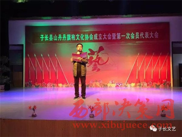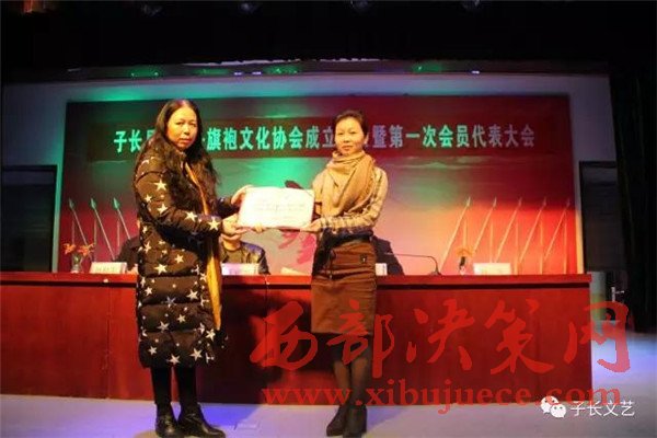 在會(huì)上,山丹丹旗袍文化協(xié)會(huì)的負(fù)責(zé)人白潔做了協(xié)會(huì)前期籌備工作的簡(jiǎn)述,文廣局副局長(zhǎng)宣讀了同意子長(zhǎng)縣山丹丹旗袍文化協(xié)會(huì)成立的批復(fù);民政局副局長(zhǎng)趙和平頒發(fā)社會(huì)團(tuán)體登記證。會(huì)中還進(jìn)行了對(duì)協(xié)會(huì)的理事會(huì),監(jiān)事會(huì),主席團(tuán)成員的選舉。當(dāng)選為協(xié)會(huì)主席的白潔在會(huì)上做了表態(tài)發(fā)言,并代表協(xié)會(huì)向協(xié)會(huì)的顧問(wèn)李建中、王明如,名譽(yù)主席王晶、張琴頒發(fā)了聘書。最后,協(xié)會(huì)會(huì)員還為觀眾們準(zhǔn)備了一道文藝表演的盛宴,大會(huì)在星光大道歌手孫秸的一曲《山丹丹開花紅艷艷》中勝利中閉幕。