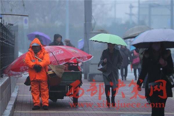 環(huán)衛(wèi)工抱著掃把簸箕在雨雪中睡著