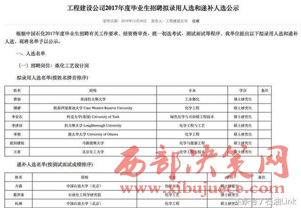 原標(biāo)題:中石化2017畢業(yè)生招聘擬錄用人員正式公示!