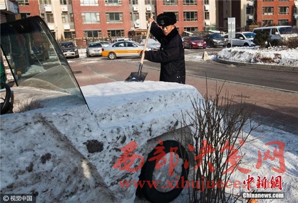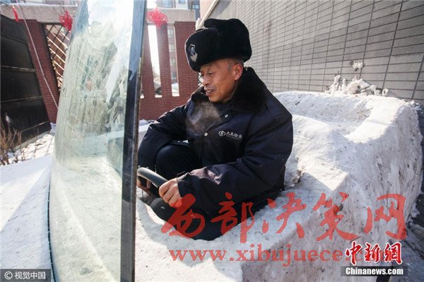 1月3日,吉林省長(zhǎng)春市,六旬保安組團(tuán)建雪雕汽車(chē),上車(chē)下車(chē)用啤酒箱當(dāng)踏板。