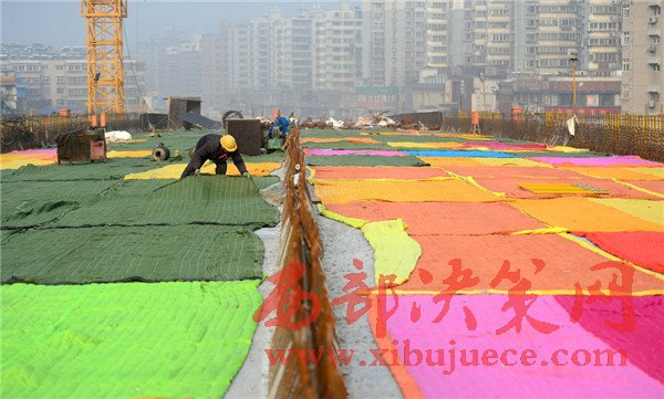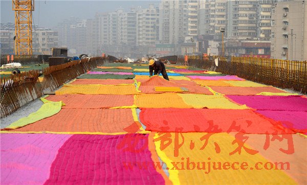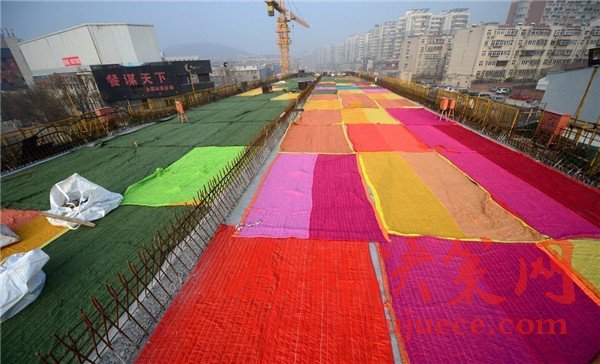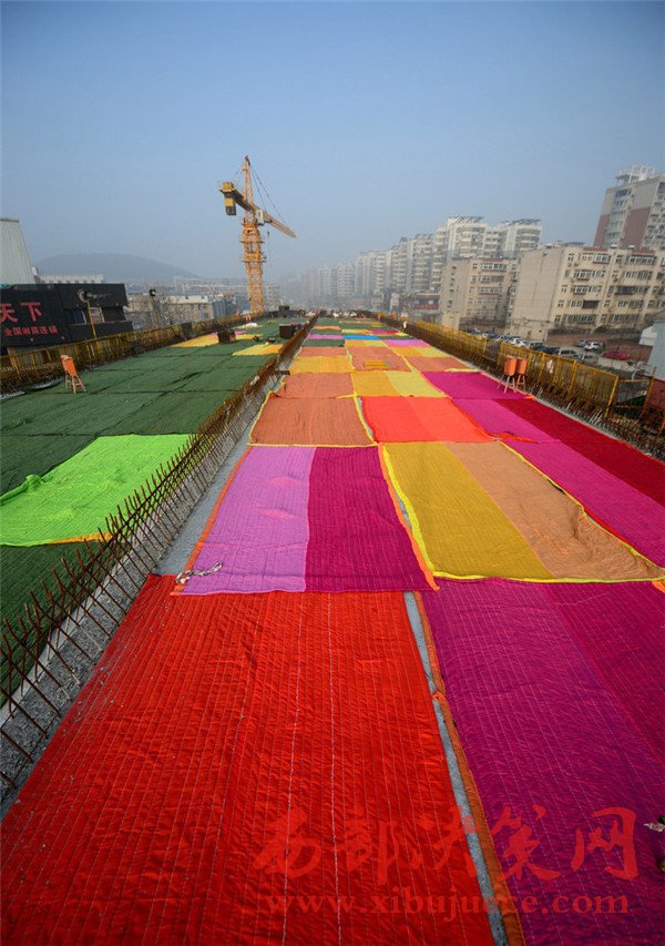 2017年1月2日,濟南,在七里山路附近的順河高架橋南延施工現(xiàn)場,百余米長的高架橋路面鋪設了彩色的棉被,總數(shù)達到100多條,覆蓋面積約2000多平方米 。據(jù)了解,該段高架橋為新澆筑的箱梁,為確保冬季低溫下混凝土能夠保證強度和防凍,施工采取多種保暖法,為路面蓋棉被取暖。