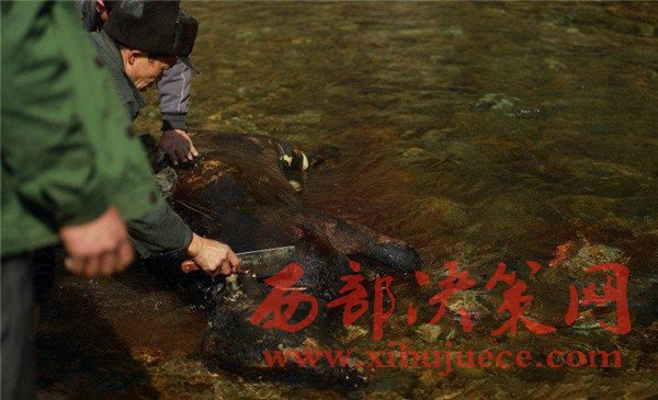 燒好的大黃牛,皮都已經(jīng)焦黃,遠(yuǎn)遠(yuǎn)的都能聞到一股燒焦的氣味。放到水里洗干凈,然后由專人開膛破腹。