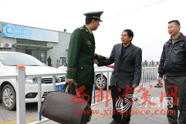 1月9日,周開樹在南黃邊防派出所為母親開具無戶籍證明后,然后帶母親來到青島,當天下午坐上了青島至成都的火車,坐在火車上,周開樹的眼前又浮現(xiàn)出當年的情景,一個11歲的少年,緊緊拉著母親的手:“媽媽,您別走,長大后我養(yǎng)活您……”圖為周開樹與南黃邊防派出所民警見面。