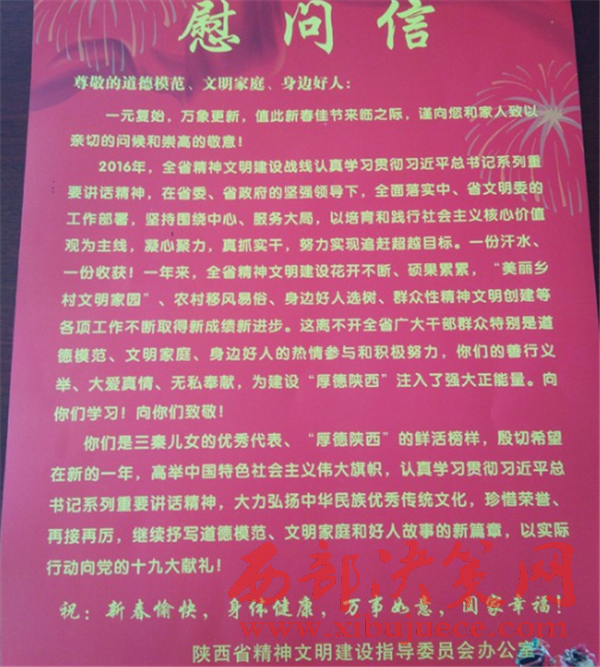 慰問組每到一戶都詳細(xì)詢問了模范們的家庭生產(chǎn)和生活狀況,囑咐他們保重身體,希望他們珍惜榮譽(yù),再接再厲,繼續(xù)發(fā)揮模范帶頭作用,在道德建設(shè)上再樹新形象,再展新風(fēng)采,再創(chuàng)新佳績(jī)。同時(shí)也號(hào)召全縣人民學(xué)好人、做好人,崇尚道德,弘揚(yáng)善舉率先垂范,樹立榜樣。