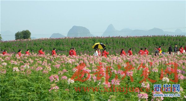 1月31日,游客在廣西來賓市忻城縣的花海中游玩。