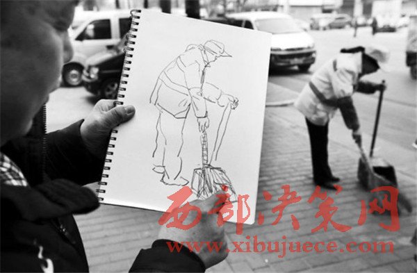 昨天下午,記者見到李福昌,他拿起素描本和記者一起出了門,家門口永新路上,一名保潔員打開道沿邊的垃圾桶,拎出內(nèi)膽,將垃圾倒進(jìn)清運(yùn)車。李福昌靜靜站在10米開外的地方,打開本子拿起筆,寥寥幾筆就將一位正在掃地的保潔員生動(dòng)形象地勾勒出來(lái)。他沒有上前打擾保潔員,保潔員也沒有發(fā)現(xiàn)他。隨后,他又來(lái)到大興路、西二環(huán),保潔員忙碌的身影都被他一一收入畫中。