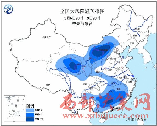 中央氣象臺(tái)預(yù)計(jì),6日夜間至9日,我國(guó)中東部大部地區(qū)都將自北向南將先后出現(xiàn)大范圍大風(fēng)降溫和雨雪天氣,平均氣溫將普遍下降4℃以上,其中,青海東部、陜西北部、內(nèi)蒙古中部、山西北部、貴州東南部、湖南中南部、江西中南部、福建西部、廣西北部和廣東北部等地氣溫將下降8℃以上,局地超過(guò)10℃!長(zhǎng)江以北地區(qū)并伴有4——6級(jí)偏北風(fēng),東部和南部海區(qū)風(fēng)力有7——9級(jí)。