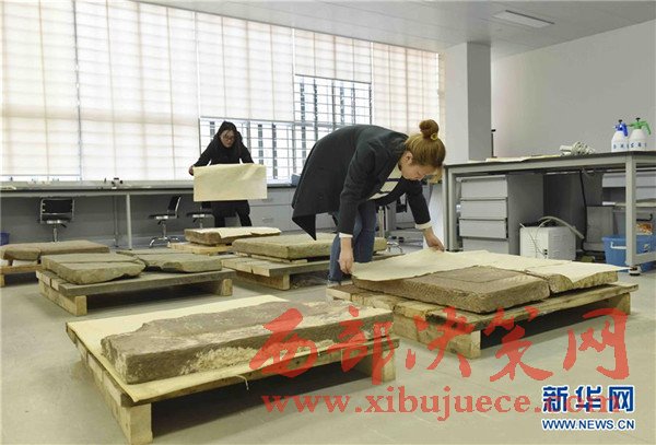 2月27日,成都考古研究所文物保護(hù)與修復(fù)中心工作人員在對清洗干凈的墓志進(jìn)行防塵保護(hù)。