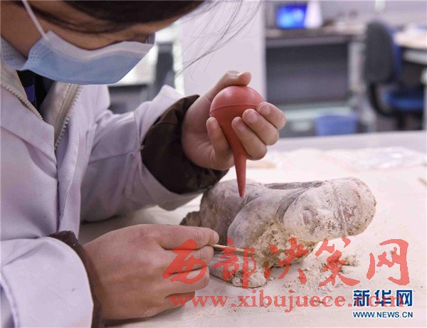 2月27日,成都考古研究所文物保護(hù)與修復(fù)中心工作人員在對出土的匍匐俑進(jìn)行清理