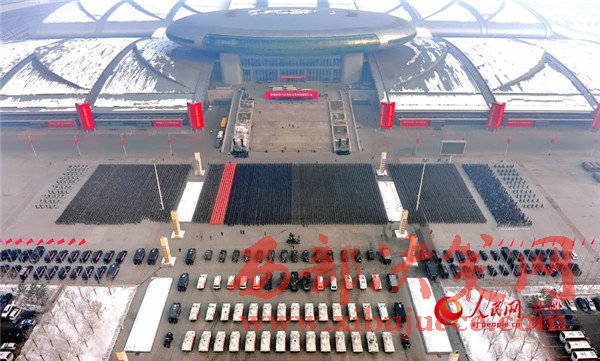 新疆國(guó)際會(huì)展中心廣場(chǎng)上,1萬(wàn)余名武警官兵、公安民警、民兵預(yù)備役人員等各維穩(wěn)力量緊握鋼槍盾牌、整齊列隊(duì)挺立,直升機(jī)在空中盤旋,一輛輛軍車、裝甲車、摩托車列隊(duì)待發(fā)。