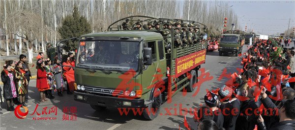 喀什市民在道路兩旁歡迎參加自治區(qū)反恐維穩(wěn)誓師大會(huì)的武警官兵。