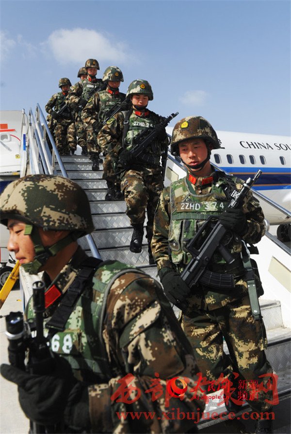 參加反恐維穩(wěn)誓師大會(huì)的武警官兵到達(dá)阿克蘇機(jī)場(chǎng),向任務(wù)區(qū)進(jìn)發(fā)。