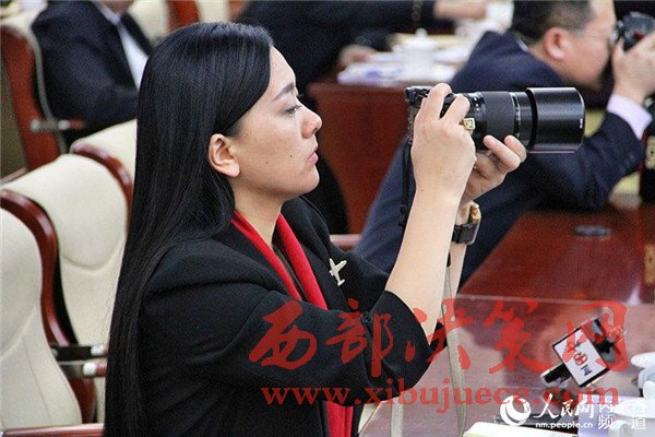 兩會(huì)上的女記者聚精會(huì)神拍攝現(xiàn)場(chǎng)照片。