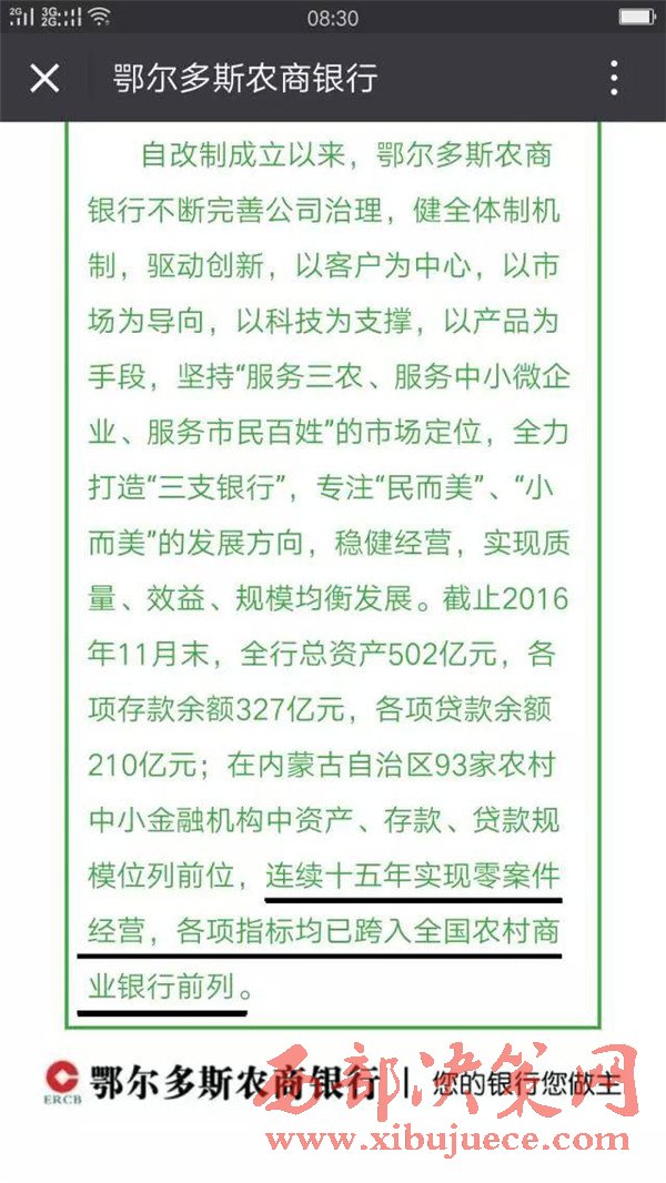 鄂爾多斯農(nóng)商銀行官方微信平臺(tái)2016年12月22日發(fā)布文章中稱:鄂爾多斯農(nóng)商銀行自改制成立以來(lái),連續(xù)十五年實(shí)現(xiàn)零案件經(jīng)營(yíng),各項(xiàng)指標(biāo)均已跨入全國(guó)農(nóng)村商業(yè)銀行前列。