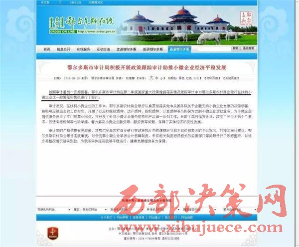 鄂爾多斯市人民政府網(wǎng)站刊登文章中稱:按照審計(jì)署統(tǒng)一安排部署,鄂爾多斯市審計(jì)局在第二季度國(guó)家重大政策措施落實(shí)情況跟蹤審計(jì)中對(duì)鄂爾多斯農(nóng)村商業(yè)銀行在扶持小微企業(yè)這一政策落實(shí)情況進(jìn)行了審計(jì)。