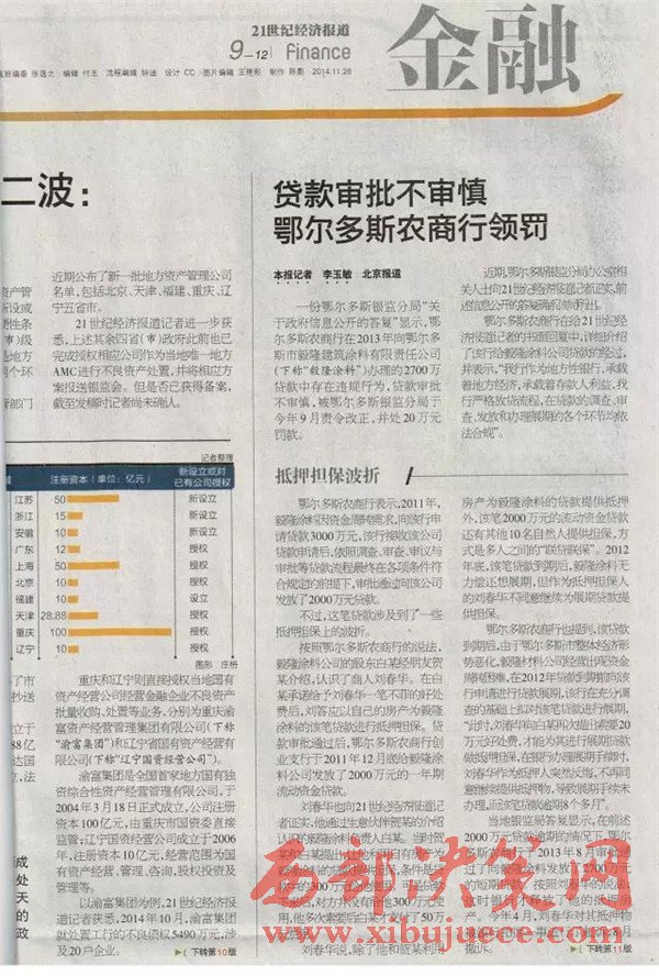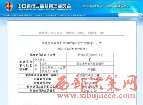 另查明:鄂爾多斯農(nóng)村商業(yè)銀行法人張?jiān)鰪?qiáng),又是內(nèi)蒙古信用聯(lián)合社理事會(huì)理事,共產(chǎn)黨黨員,管理不善,多次因非法經(jīng)營(yíng)舉報(bào),其中2012年2月29日,因違規(guī)簽發(fā)承兌匯票被內(nèi)蒙古銀監(jiān)局罰款50萬(wàn)。