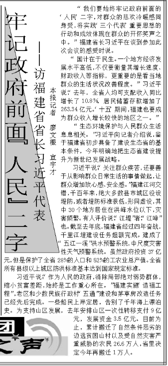 “我們要始終牢記政府前面的‘人民’二字,對群眾的悲歡冷暖感同身受。”2002年3月4日,人民日報(bào)兩會特刊的“代表團(tuán)之聲”欄目里,刊發(fā)了對時(shí)任福建省省長的習(xí)近平代表的采訪,標(biāo)題是《牢記政府面前“人民”二字》。