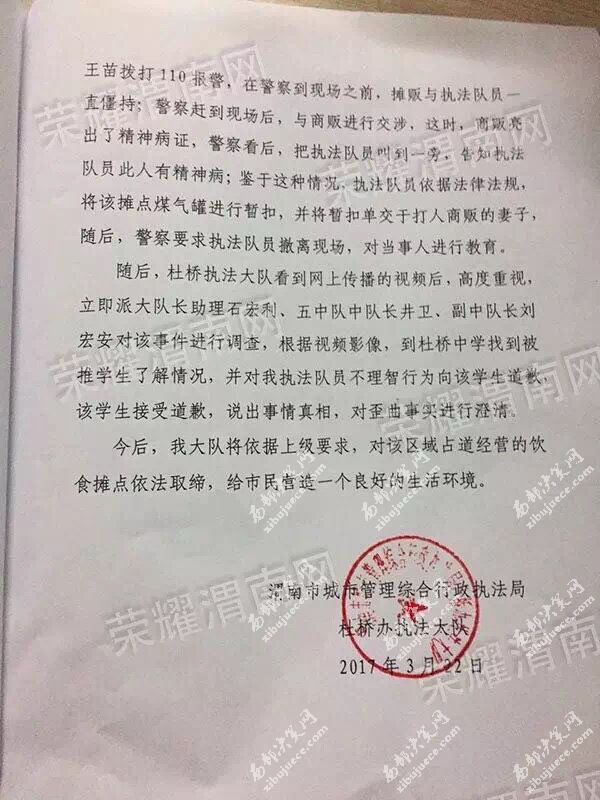 當(dāng)晚6點以后,涉事執(zhí)法隊員所屬執(zhí)法大隊杜橋執(zhí)法大隊書面回復(fù)便在網(wǎng)絡(luò)中被網(wǎng)友們不斷的轉(zhuǎn)載。據(jù)該回復(fù)稱:2017年3月22日中午12時40分左右,杜橋執(zhí)法大隊市容機動中隊謝鵬、朱勇、康忠民、王苗等4名執(zhí)法隊員在杜橋中學(xué)門前取締占道經(jīng)營飲食攤點,當(dāng)時有八個攤點在此經(jīng)營,七個已勸離,其中一戶不愿離開,與執(zhí)法隊員康忠民發(fā)生言語沖突,在康忠民要求其搬離此處,禁止銷售時,攤點經(jīng)營者情緒激動,突然,用鋼管圓凳子砸向執(zhí)法隊員康忠民,致使康忠民胳膊、背部等多處軟組織損傷,執(zhí)法隊員謝鵬、王苗等見狀,立即趕到康忠民處進(jìn)行勸導(dǎo),在勸導(dǎo)過程中,杜橋中學(xué)一名學(xué)生說城管打人,不明真相的約五六十名學(xué)生一起起哄、謾罵城管,因康忠民被打,情緒比較激動,見學(xué)生歪曲事實,上前推了一下起哄的學(xué)生,隨后,機動中隊執(zhí)法隊員朱勇、陳新亮、魏楠、徐嬌、姜寧寧、孫偉珍趕到現(xiàn)場,準(zhǔn)備對該攤點煤氣罐進(jìn)行暫扣,在執(zhí)法隊員朱勇關(guān)閉液化氣罐閥門時,攤點經(jīng)營者用鋼管圓凳砸向朱勇手臂處,致使朱勇左前臂及手背部多處軟組織損傷,打完人后,打人攤販妻子將凳子抓住,阻止攤販再次打人,這時,攤販用左手抓起攤位上的刀具,威脅城管隊員,并大聲說“這是市長讓他在此擺攤”,這時,旁邊另一名攤販上前奪取打人攤販左手所持的刀具;為了不與攤販再次發(fā)生肢體上的沖突,執(zhí)法隊員王苗撥打110報警,在警察到現(xiàn)場之前,攤販與執(zhí)法隊員一直僵持;警察趕到現(xiàn)場后,與商販進(jìn)行交涉,這時,商販亮出了精神病證,警察看后,把執(zhí)法隊員叫到一旁,告知執(zhí)法隊員此人有精神??;鑒于這種情況,執(zhí)法隊員依據(jù)法律法規(guī),將該攤點煤氣罐進(jìn)行暫扣,并將暫扣單交于打人商販的妻子,隨后,警察要求執(zhí)法隊員撤離現(xiàn)場,對當(dāng)事人進(jìn)行教育。