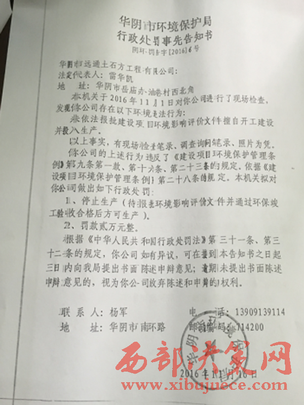 一份2016年11月23日《華陰市環(huán)境保護局行政處罰決定書》復印件顯示,環(huán)保局于2016年11月1日對該公司進行了現(xiàn)場檢查,發(fā)現(xiàn)該公司存在未依法報批建設(shè)項目環(huán)境影響評價文件擅自開工建設(shè)并投入生產(chǎn)。處罰是停止生產(chǎn)和罰款2萬元。