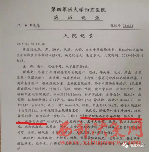 2015年3月我小兒子劉龍龍由感冒引發(fā)急性尿毒癥第五期,從此我們一家過上了人間少有的被恐懼包圍的日子。時至今日我們輾轉榆林星元醫(yī)院、西安西京醫(yī)院、西安交大附屬醫(yī)院等大醫(yī)院治療,前后做了8次血漿置換腹膜透析手術。每天透析3、4次,每一個月病人住院花費四、五萬元。2年時間花費110多萬元,現(xiàn)在就靠透析維持生命。因此醫(yī)生對我說,我兒子做透析不是長久之計,唯