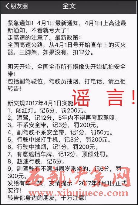 1.【謠言】“4月1日起高速上查車,沒有滅火器扣12分;同時新交規(guī)開始實施……”近日,這則關(guān)于“4月1日起新交通法規(guī)將實行”的消息出現(xiàn)在多地網(wǎng)民的微信朋友圈中。在網(wǎng)傳的消息中,“不系安全帶記3分、罰200元,副駕駛不系安全帶記1分、罰50元,行駛中撥打手機記3分、罰200元,行駛中抽煙記1分、罰200元……”種種條款讓網(wǎng)民頗為緊張。