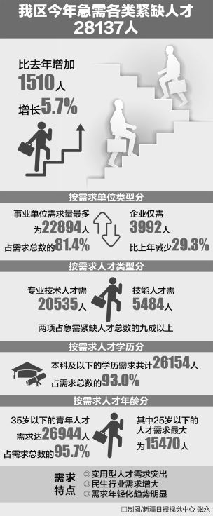 新疆急需緊缺人才需求年輕化趨勢明顯。2017年,35歲以下的青年人才需求達26944人,占需求總數(shù)的95.7%,其中25歲以下的人才需求最大,為15470人。“推進絲綢之路經濟帶核心區(qū)建設,急需具有創(chuàng)新活力的青年人才來疆謀事創(chuàng)業(yè)。”趙倩說。