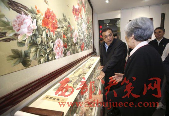 李克強(qiáng)2017年5月8日晚來(lái)到開封七盛角民俗文化街,在王素花汴繡館長(zhǎng)時(shí)間駐足。82歲的王素花多年繼承創(chuàng)新宋代傳統(tǒng)刺繡工藝,是汴繡領(lǐng)軍人物??偫碜屑?xì)觀賞后稱贊她用色“多而不雜”,技藝“爐火純青”。