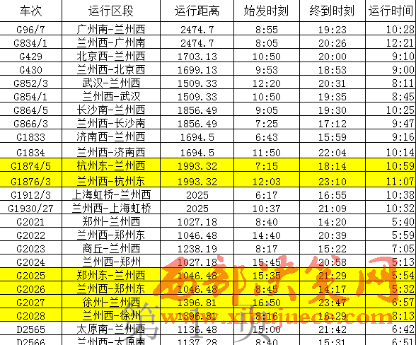 從寶蘭高鐵列車開行方案來看,蘭州西至北京西開行動車組列車1對,為列車雙向?qū)﹂_,共計運(yùn)行1699公里,9:53從蘭州西站始發(fā),18:53達(dá)到北京西站,車次為 G430次,運(yùn)行時間9小時整;10:50從北京西站始發(fā),20:00到達(dá)蘭州西站,車次為 G429次。蘭州西至廣州南開行動車組列車1對,為列車雙向?qū)﹂_,共計運(yùn)行2474.7公里,8:05從蘭州西站始發(fā),20:26到達(dá)廣州南站,車次為 G834/1次;8:55從廣州南站始發(fā),19:23到達(dá)蘭州西站,車次為 G96/7次,運(yùn)行時間10小時28分。蘭州西至上海虹橋站開行動車組列車1對,為列車雙向?qū)﹂_,共計運(yùn)行2025公里,10:37從蘭州西站始發(fā),21:09到達(dá)上海虹橋站,車次為 G1930/27次,運(yùn)行時間10小時32分;6:17從上海虹橋站始發(fā),16:55到達(dá)蘭州西站,車次為 G1912/3次。